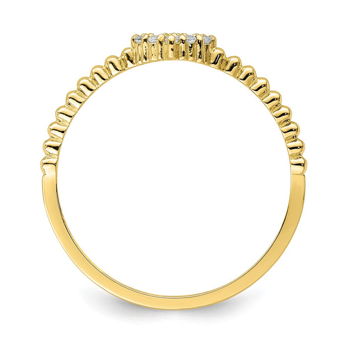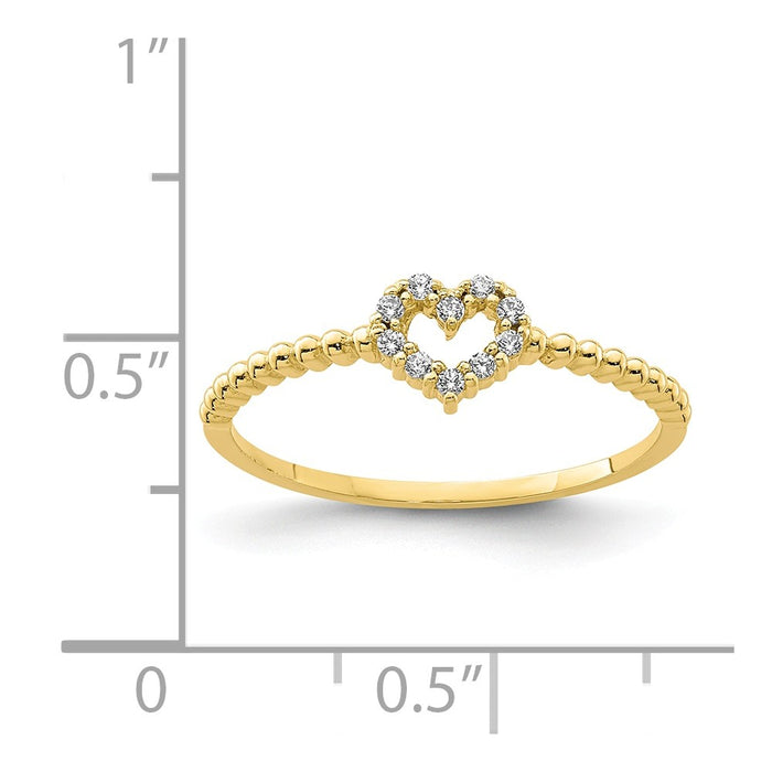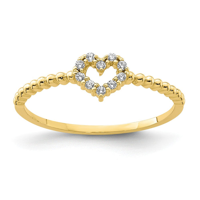 Model No. MCQG10YC403 - 10k Yellow Gold Heart CZ Ring, Size: 7 - Specifications: Material: Primary - Purity: 10K|Finish: Polished|Stone Type 1: Cubic Zirconia (CZ)|Stone Color 1: White|Stone Quantity 1: 10|Band Width: 1 mm|Feature: Solid|Material: Primary: Gold|Sizeable: Yes|Stone Shape 1: Round|Stone Treatment 1: Synthetic|Thickness: >1 mm|Product Type: Jewelry|Jewelry Type: Rings|Sold By Unit: Each|Material: Primary - Color: Yellow|Ring Type: Themed|Ring Top Length: 5.4 mm|Ring Top Width: 6.28 mm|Stone Creation Method 1: Synthetic