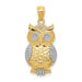 Million Charms 14K Yellow Gold Themed, Rhodium-plated Polished & Textured Owl Pendant - Jewelry, Pendants & Charms, Themed Charms, Birds, Owls - Purity: 14K|Finish: Polished|Length of Item: 26.7 mm| Accents: Rhodium| Accent Color 1: White|Charm/Element Length: 22.2 mm|Charm/Element Thickness: 2.2 mm|Charm/Element Width: 12 mm|Feature: Solid|Manufacturing Process: Casted| Width of Item: 12 mm|Jewelry Type: Pendants & Charms|Gender: Men's|Texture: Textured|Profile Type: Open Back|Bail Width: 4.5 mm| Color: Two-Tone|Bail Length: 6.2 mm - Made in: United States