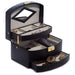 Occasion Gallery Black Color Black Leather 3 Level Hinged Jewelry Box with Mirror, Travel Roll and Locking Clasp. 6.5 L x 5 W x 5 H in.